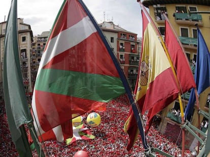 Colocada la ikurriña en la fachada del Ayuntamiento de Pamplona minutos antes del chupinazo