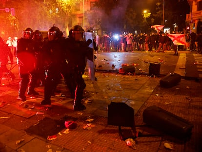 La Policía Nacional carga contra los manifestantes para despejar la calle de Ferraz, sede central socialista, donde han sido detenidas tres personas