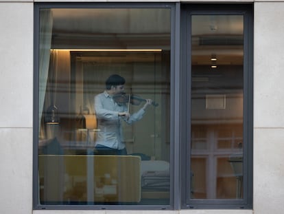 Un músico responde a los mensajes en un papel pegados desde un cristal del otro lado de la calle y cuenta su historia