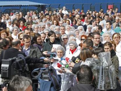 Dos empleadas leen un comunicado suscrito por los comités de empresa donde piden "el cese de campañas interesadas" con la firma gallega en preconcurso de acreedores