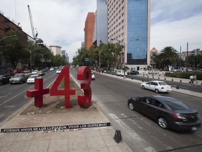 Los familiares del 'caso Iguala' colocan en la avenida más simbólica de México DF una escultura con el número de las víctimas: 43