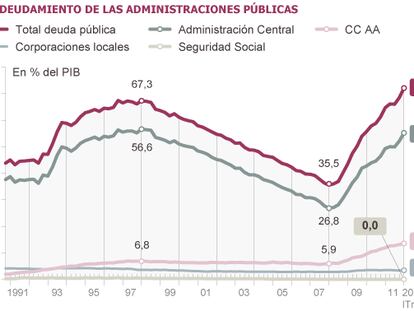 El endeudamiento de las administraciones públicas pasa del 35,5% en el primer trimestre de 2008 al 72,1% en marzo de este año. Es el mayor registro desde 1990, cuando empieza la serie del Banco de España