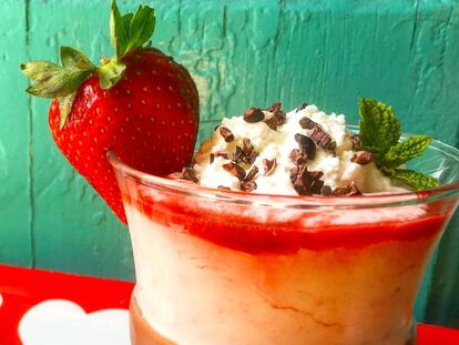 Rendimos homenaje a las ochenteras fresas con nata, expulsadas del paraíso por culpa de la nata de espray, con esta mousse con poquísimo azúcar añadido y un toque de chocolate.