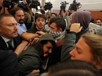 Varias decenas de personas han irrumpido con violencia en un acto en el que participaban el expresidente del Gobierno Felipe González y el presidente del Grupo PRISA, editor de EL PAÍS, Juan Luis Cebrián
