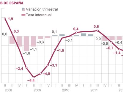 La economía española enlaza siete trimestres en retroceso por el desplome del consumo En tasa anual, el descenso del PIB llega ya al 2%, como adelantó el Banco de España