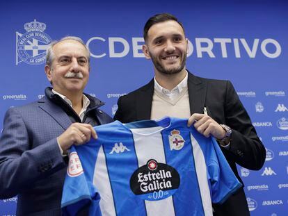 El delantero coruñés, que baja dos categorías para regresar a su equipo del alma, fue presentado en Riazor ante más de 10.000 espectadores