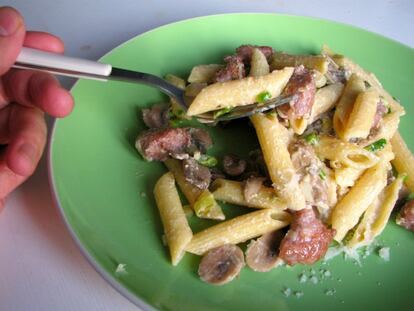 Macarrones con salchichas, champiñones y ajos tiernos.