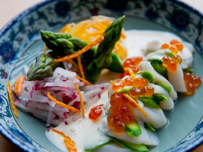 Espárragos verdes con mayonesa de berros.