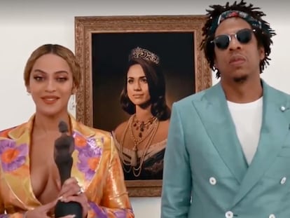 La cantante y su marido, Jay-Z, aceptan un premio Brit con un vídeo en el que aparece un retrato de la duquesa de Sussex. Un guiño a su clip del Louvre y un homenaje al Mes de la Historia Negra con el que felicitan a Markle por su embarazo y salen en su defensa.