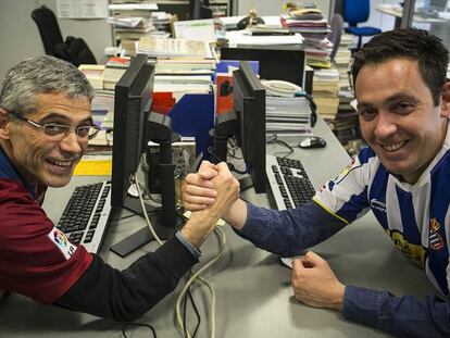 Cara a cara dels periodistes Carles Geli i Cristian Segura en la retransmissió en directe del partit