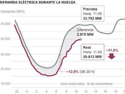 La caída de la demanda para la actividad productiva se recupera a medida que avanza el día El indicador de energía imputable a la actividad productiva sitúa la adehsión al 14-N en el 66%