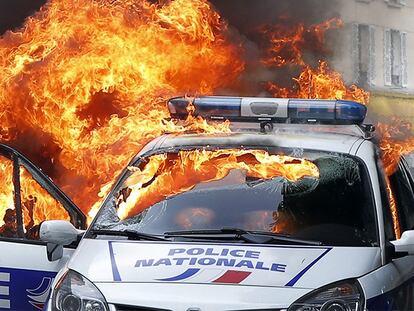 Un vídeo capta cómo unos encapuchados incendian el vehículo con dos agentes dentro