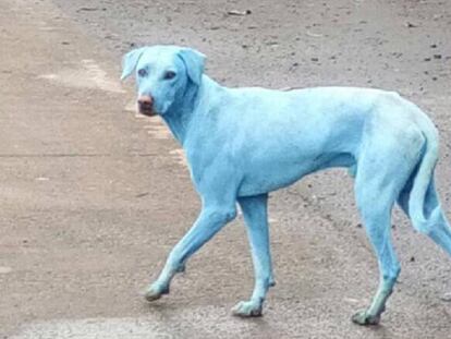Varios perros de Bombay se vuelven azules por el agua de un río contaminado