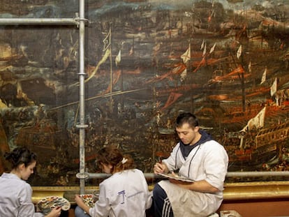 El Museo Naval muestra en directo la restauración de un cuadro de la célebre batalla El lienzo, pintado en la segunda mitad del XVII, tiene unas dimensiones de 300 x 536
