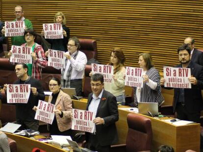 Los diputados de los tres grupos de izquierda no participan en la votación y exhiben carteles por una cadena "pública y en valenciano"