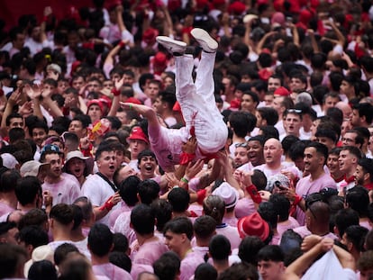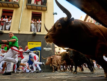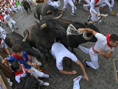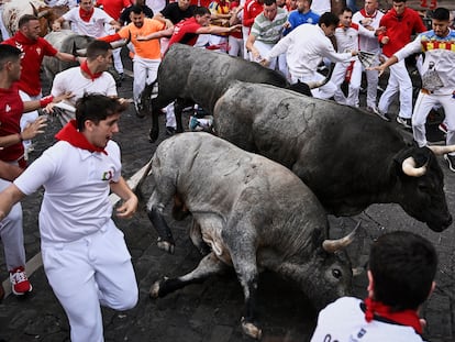 Los astados de la ganadería de Victoriano del Río recorren las calles de Pamplona en una manada compacta en 2 minutos y 19 segundos y dejan cuatro heridos