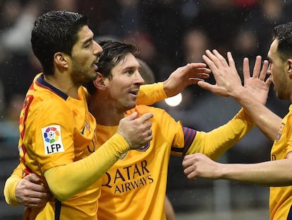 Con el gol de Luis Suárez y el doblete de Messi, la delantera del Barcelona alcanza el centenar de tantos en esta temporada