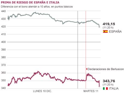 La prima de riesgo italiana avanza de golpe en 28 puntos básicos, hasta los 351 El diferencial entre los bonos españoles y los alemanes repunta a 425 puntos