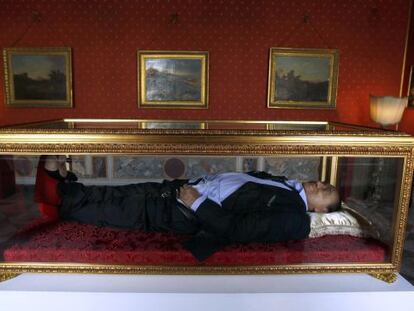Dos artistas italianos recrean una estatua de 'Il cavaliere' con las pantuflas de Mickey Mouse y una mano metida en los pantalones