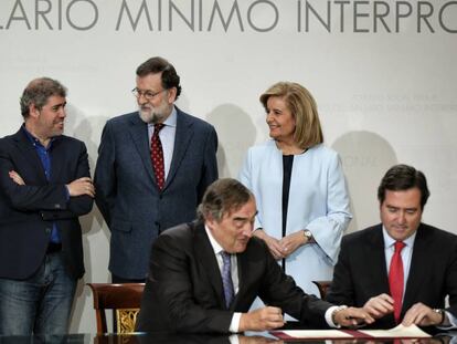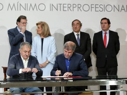 Mariano Rajoy firma con sindicatos y patronales el pacto para que se eleve el sueldo más bajo hasta los 850 euros de ahora a 2020