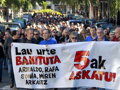 La manifestación para liberar a Arnaldo Otegi ha estado encabezada por una pancarta con el lema, Cuatro años secuestrados