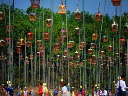 Cientos de pajaritos compiten por el mejor trino durante el concurso anual de aves canoras que se celebró el domingo 23 de marzo en la provincia tailandesa de Narathiwat