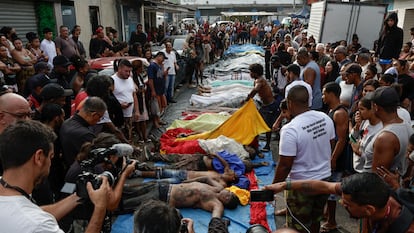 Los restos de las víctimas mortales han sido colocados en fila en el suelo de una plaza de la favela Vila Cruzeiro, para que sus allegados puedan identificarlos