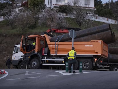 La máquina ha tenido que ser trasladada en dos partes hasta la rampa de acceso a la finca donde está el agujero; allí espera para superar el último tramo y llegar a la zona donde se busca a Julen