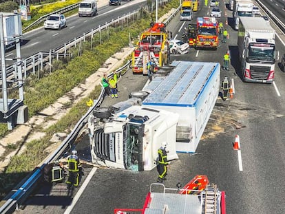 Un camión cargado de cerdos vuelca en la A-6 y provoca un importante atasco