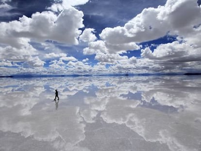 La fina capa de agua que cubre el salar de Uyuni, en Bolivia, produce un efecto espejo en el que el viajero parece caminar por las nubes