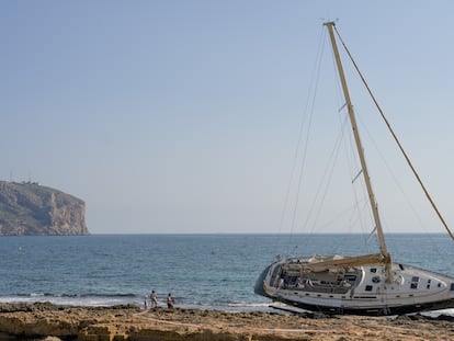 El barco lleva más de dos semanas encallado en las rocas protegidas de la bahía de la población alicantina ante la gran dificultad para reflotarlo. Un año lleva varado en Formentera el velero que fue propiedad del director Von Karajan