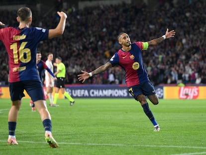 Los azulgrana, liderados por la mejor versión del capitán Raphinha, autor de tres goles, completan un extraordinario partido contra los alemanes en un encendido estadio de Montjuïc