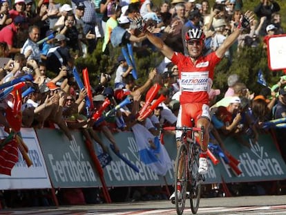 El italiano Cataldo se impone en las durísimas rampas del puerto asturiano y Joaquim Rodríguez reafirma el liderato tras aguantar los sucesivos ataques de Contador