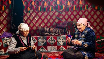 Los productos de fieltro de Kirguistán tienen un valor tanto práctico –protegen del frío intenso– como simbólico: en efecto, están ricamente decorados con preciosos bordados inspirados en el medio ambiente, las plantas y los animales del lugar, y también en motivos cosmológicos y religiosos.