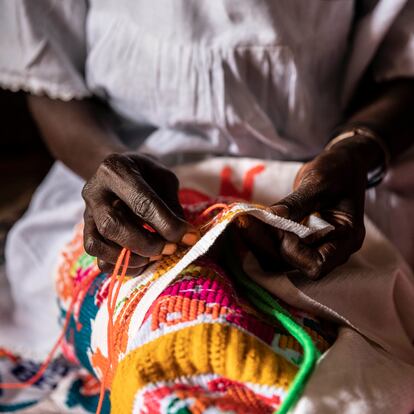 “Soy marcadora desde los 12 años. Primero se empieza haciendo diseños y contando hilos. Luego, al bordar, si te equivocabas, te pegaban”. A base de paciencia y golpes, aprendió el que hoy es su oficio de una tía. “Antes, los mayores se beneficiaban de lo que nosotras marcábamos; ya no es así gracias a la asociación. Ahora trabajamos y se nos paga. Esto es un empleo para acabar con la pobreza; para costear todo, para no tener que pedir prestado para comer”, cuenta.