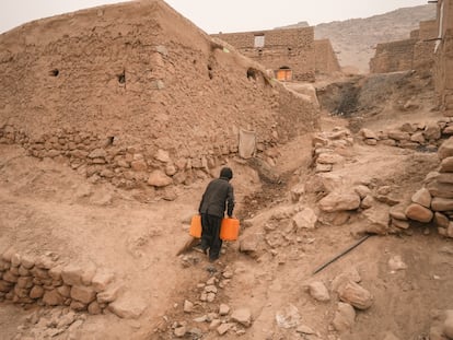 “La falta de recursos a raíz de la sequía nos ha sumido en la miseria absoluta. No disponemos de dinero para hospitalizar a mi hija pequeña porque lo poco que tenemos lo gastamos en comida”, apunta Fátima desde el salón donde, junto a dos viejas butacas forradas de color verde, está la cama sobre la que yace tumbada Zakia, de 27 años. “No puede moverse ni levantarse. Por eso está conectada a una sonda que debo revisar y vaciar constantemente”, explica con resignación una madre que además, también ejerce de enfermera, ama de casa y campesina.