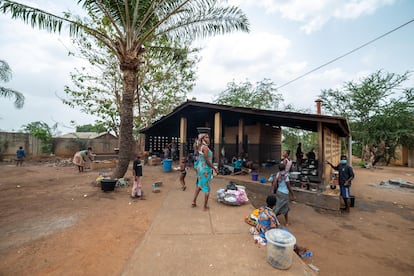 Las de Lalo son inmensas, pero muy simples, pues no hay armarios ni neveras; solamente espacios separados donde se puede encender un fuego o usar un hornillo. Y muchísimas cacerolas de todos los tamaños. De entre los fogones salen y entran constantemente mujeres, algunas de ellas con bebés a la espalda, como Elise Akvi, que lleva desde enero cuidando a su hija Chantalle, de 10 años, ingresada con Buruli. Otras están solas. Es el caso de Bernadette Kenapo, de 20 años, llegada en junio de 2021 con una fascitis necrosante. Fue hospitalizada junto a su bebé, que entonces tenía tres meses de edad. A él no le ocurre nada más que no tiene a otra persona que le cuide. “Mi marido trabaja fuera, pero me manda dinero”, concede.