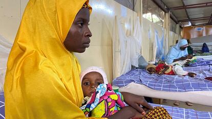 Frente a la cama de Fátima, Sahura Hassan, de 21 años, llevó a su hijo al centro de tratamiento de Damaturu porque había dejado de comer, tenía fiebre, no podía sentarse y estaba gravemente deshidratado. “La mayor parte del problema que observamos en estas áreas se debe al escaso acceso a los alimentos debido a la inseguridad; hay insuficiencia alimentaria en cada uno de los hogares”, afirma Japhet Udokwu, el médico encargado del centro de tratamiento.