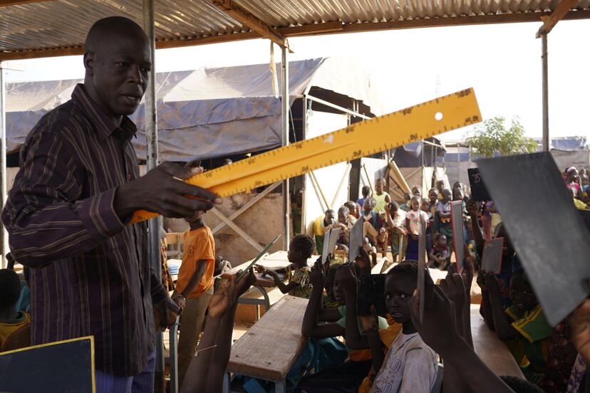 Según Unicef, al menos 6.000 centros educativos continúan cerrados en Burkina Faso y un millón de niños no pueden ir a la escuela debido a la inseguridad. Desde 2020, la escuela de Titao, un pueblo situado a unos 50 kilómetros al norte de Ouahigouya, se ha trasladado a esta ciudad para continuar con las clases. Director, maestros y alumnos siguen el curso en unos equipamientos construidos para atender esta emergencia. Esta medida es conocida como “escuelas deslocalizadas” y también incluye los cursos de reenganche. Saliata, de 10 años, es una de las alumnas. Nunca antes había ido a la escuela, pero ahora puede contar hasta casi el infinito gracias a esta formación intensiva y ha empezado las clases por primera vez. A su lado, sentado con los brazos cruzados y un constante vaivén de piernas, está Rasmane (ocho años) que va un curso por delante. Antes de que la violencia de los terroristas le obligara a dejar su pueblo, él había ido a la escuela. “De grande quiero ser maestro para enseñar a leer y escribir”, dice resuelto.