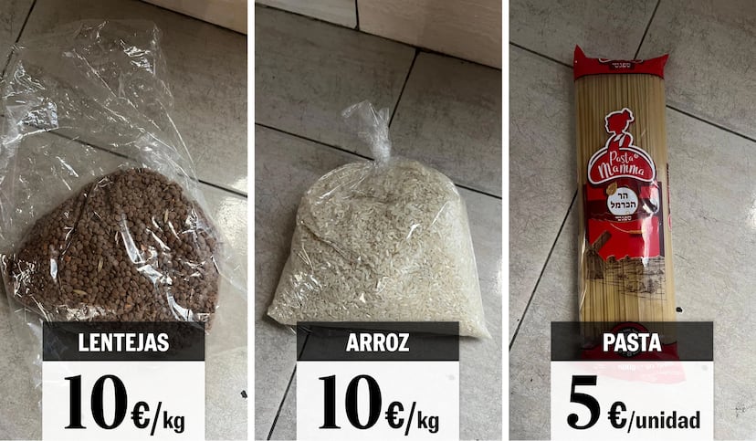 Un pequeño envase de humus cuesta cinco euros y una porción de carne enlatada llega a 30 séqueles (7,5 euros). El vendedor ofrece arroz que extrae de un saco con las iniciales del PMA (Programa Mundial de Alimentos de la ONU). “Diez euros el kilo”, anuncia. No es difícil adivinar cómo ha llegado hasta allá. Omar lo compra.
