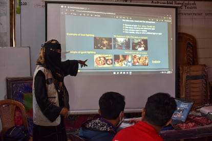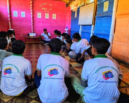 Todavía sin sede estable, utilizan para las clases los espacios que los organismos internacionales les prestan. Los talleres, que duran dos días, son gratuitos e incluyen la comida, muestran los rudimentos básicos de la fotografía que los jóvenes podrán poner en práctica con sus teléfonos móviles. “Y algunas de sus fotos, incluso, se han expuesto ya en todo el mundo”, explica. En torno al 20% del millar de estudiantes que han pasado por la escuela han sido mujeres, asegura Salim. Y, en general, “aunque ha habido grupos de estudiantes, la mayoría se tratan de jóvenes rohinyás que trabajan con organizaciones humanitarias que apoyan los servicios de saneamiento, comunicaciones…”.