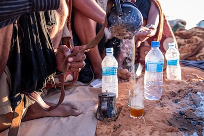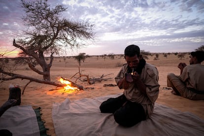Esta noche, los meharistas han montado su campamento en la cresta de una duna. El aire está lleno de arena. Las llamas de una hoguera crepitante se reflejan en el té que se vierte de un vaso a otro muchas veces, hasta que se forma una espesa capa de espuma en la superficie. Uno de ellos escucha música en el móvil mientras fuma tabaco en un hueso de cabra vaciado.