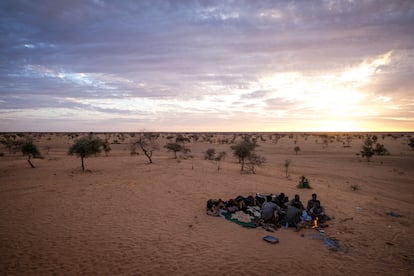 El grupo espera a sus dos compañeros en una empinada duna de arena. “Ahí está la frontera”, dice Messoud mientras señala unos arbustos en el horizonte. A veces pueden ver a los yihadistas. Hace unos meses vieron unas columnas de humo que se elevaban sobre el lado maliense y se encontraron con unos aldeanos. “Habían tenido que huir porque sus aldeas estaban en llamas”, dice con un suspiro.