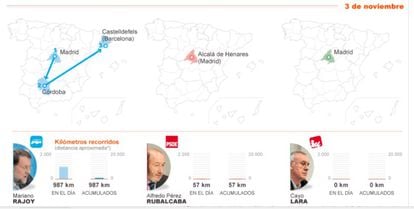 Aunque la partida empezó hace ya meses, esta madrugada el árbitro ha pitado oficialmente el inicio del encuentro entre Alfredo Pérez Rubalcaba y Mariano Rajoy. Las caravanas son los equipos con los que contarán hasta las elecciones del 20 de noviembre. Con el objetivo de darle la vuelta a las encuestas, que le son desfavorables, el candidato socialista recorrerá más de 12.000 kilómetros en los 15 días que va a durar la campaña electoral. Viajará por 14 comunidades autónomas. Quedan fuera Cantabria, Murcia y las islas Canarias, territorios que ya ha visitado durante la precampaña electoral, y las dos ciudades autónomas. El candidato del PP visitará, en cambio, las 17 comunidades y se calcula que recorrerá, en distintos medios de transporte, cerca de 15.000 kilómetros.