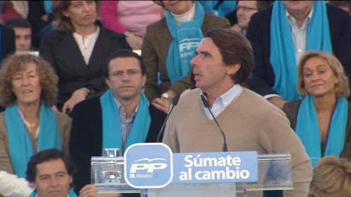 Previamente, Aguirre ha prometido que "dentro de ocho días se va a acabar la pesadilla del peor gobierno de la democracia" porque el día 20 se van "a llenar las urnas de votos del PP". La presidenta de Madrid ha subrayado la "suerte" de contar con Aznar en el mitin, que dejó a España hecha un potosí con "una ETA que retrocedía y con un Estado que no caía en concesiones, con un índice de paro y una prima de riesgo similares a los de Alemania, en la primera división del mundo y respetada y temida en Bruselas, donde Aznar iba como un jabato a defender los intereses de los españoles y por eso le temían".