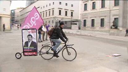 El partido ecologista Equo ha recorrido a pedales el centro de Madrid, en una marcha reivindicativa para exigir una regeneración política, económica y financiera. Su particular caravana electoral, en bicicleta, ha parado ante lugares simbólicos como el Banco de España y el Congreso, que simbolizan los elementos del sistema que piden "reiniciar".