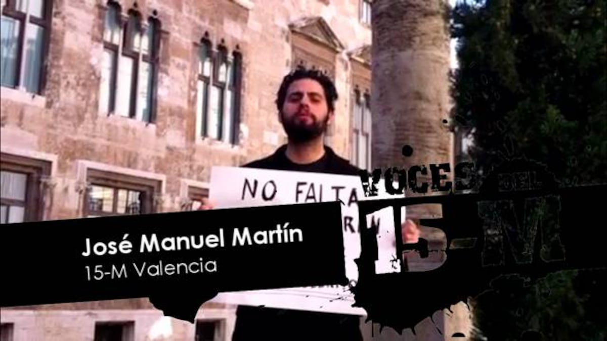La vergüenza del caso Gürtel, la ausencia de consecuencias políticas en el partido gobernante en la Comunidad Valenciana, el PP, y la manipulación informativa en la televisión autonómica Canal 9 llevaron a José Manuel Martín, valenciano de 28 años, a implicarse a partir de 2009 en diversos colectivos de protesta. De ahí, al 15-M. Y como de la indignación, se puede hacer tanto afición como investigación, Martín, profesor de inglés, está haciendo ahora una tesis doctoral de Lingüística Aplicada sobre el 15-M ya que está muy interesado en el empleo de medios virtuales, esto es, las redes sociales, para hacer más visibles las manifestaciones reales, las físicas, como las protestas en la calle. En concreto le apasiona el uso y la evolución de los hashtags (etiquetas que crean los usuarios de Twiter para abrir temas de debate).