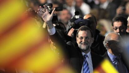 Mariano Rajoy visitó este miércoles por última vez Cataluña en campaña y, como él mismo dijo, se llevó "un chute" de entusiasmo y de banderas catalanas, españolas y del PP agitadas y gritos de "!presidente, presidente!", pero él no se molestó siquiera en alterar su discurso diario. En esta comunidad se juega parte de la holgada mayoría, porque es uno de los territorios que le ha sido más adversos, pero él siguió a lo suyo.