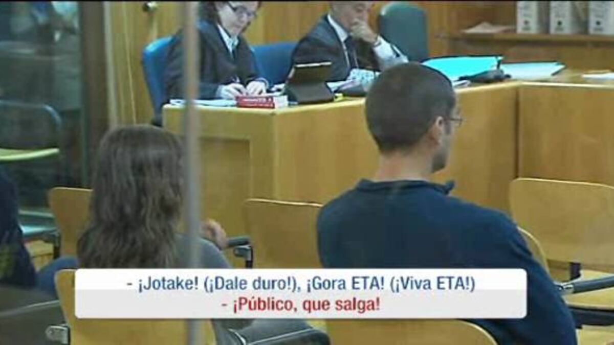 Inmediatamente después, ha comenzado a proferir gritos de "Gora ETA", por lo que la presidenta de la sala ha pedido refuerzos, mientras una decena de personas que asistía como público se ha levantado para vitorear a los acusados, a los que animaban con las expresiones "Jo ta ke" (dale duro) y "Aupa". Por ello, la magistrada ha ordenado desalojar la sala y llevar a los tres supuestos etarras a los calabozos y continuar la vista "sin su presencia".