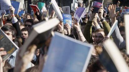Eso era todo: un libro, un folio, unos apuntes. Esas y sus manos abiertas y alzadas son el arsenal de “armas” que este martes exhibieron los miles de ciudadanos, muchos sin hijos ya en edad de estudiar, que acudieron a la manifestación de Valencia para “solidarizarse” y “proteger” a los estudiantes de las desproporcionadas cargas policiales. Entre los miles de concentrados, no hubo “terroristas” ni “pasamontañas”, ni contenedores quemados. Ni detenidos. Tampoco hubo policía. Solo una “indignación” generalizada por la “criminalización” que se ha hecho de los estudiantes valencianos desde la Delegación del Gobierno y la Jefatura Superior de Policía de la Comunidad Valenciana y que se expandió con fuerza desde todas las esquinas del céntrico instituto público Lluís Vives, epicentro de las protestas, durante toda marcha. Los valencianos piden la libertad sin cargos de todos los detenidos: 43 estudiantes en total desde el miércoles que fueron liberados, aunque doce de ellos con cargos.